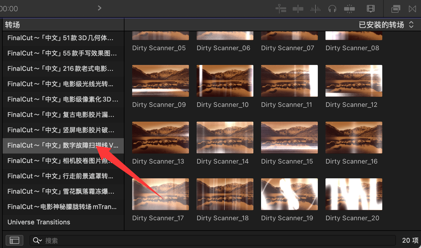 Final Cut Pro中文FCPX插件:数字故障扫描线VHS噪点扭曲帧移失真效果 Dirty Scanner Transitions Pack HQ0577